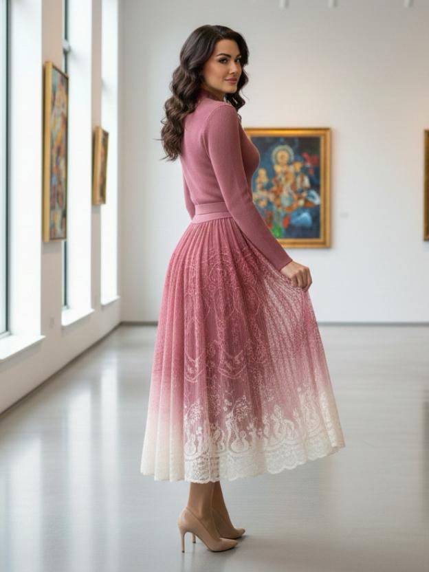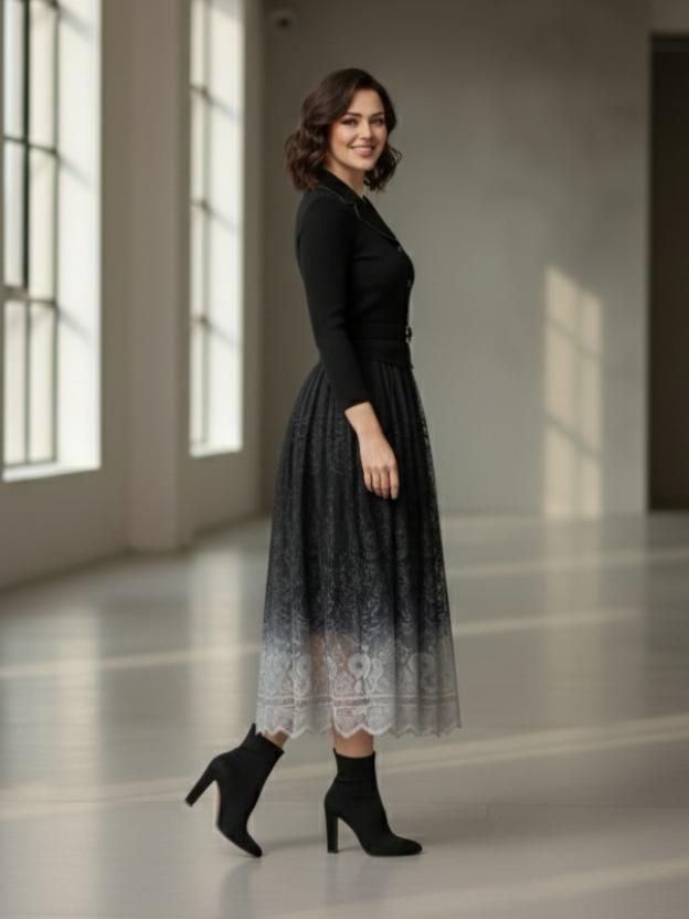 The upper bodice features a classic collared neckline with button detailing, lending a polished and refined appeal. A belted waist design enhances the silhouette, creating a graceful fit-and-flare shape. The highlight of this dress is the luxurious lace ombre skirt, flowing beautifully with every step and adding a touch of feminine charm.