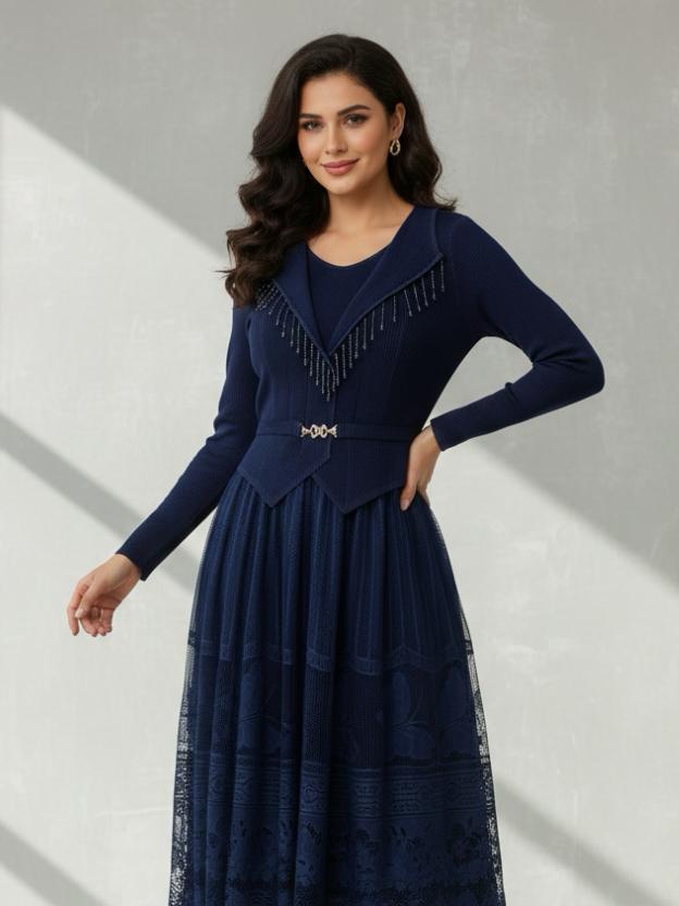 Available in classic navy blue, soft dusty rose, and elegant black, this dress transitions effortlessly from day to night.
