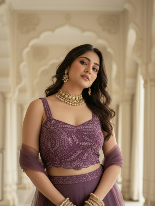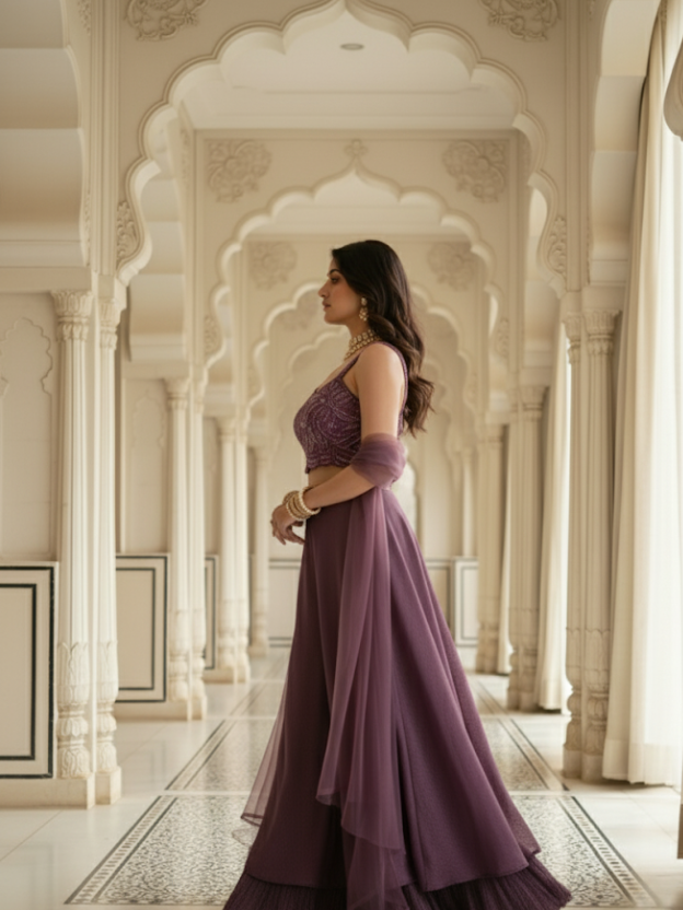 This elegant purple crop top and palazzo set, crafted for modern women who love a blend of traditional charm and contemporary style.